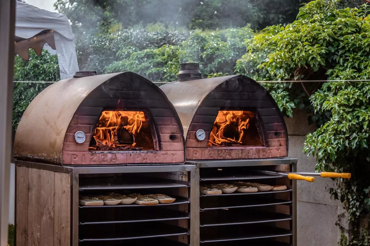 Ons team brengt de houtovenpizza’s naar uw locatie, compleet met een compact platform op luchtbanden. Zo kunnen we vlot smalle doorgangen (vanaf ±80 cm) en minder ideale ondergronden zoals grind, modder of gras passeren. De oven wordt altijd buiten opgesteld, en onder onze strakke partytent ontstaat een gezellig pizzakraam, inclusief buffettafel afgewerkt in steigerhout die perfect in het geheel past.